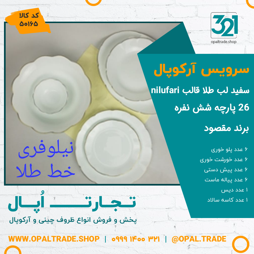 سرویس 26 پارچه طلادار مقصود سفید لب طلا قالب نیلوفری کد 50165