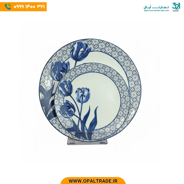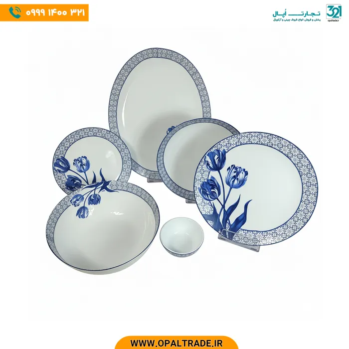 - طراحی شیک و کلاسیک: طرح گل تولیپ آبی با جزئیات ریز و نقوش مرزی، این سرویس را به یک اثر هنری تبدیل کرده که هم در مهمانیها و هم در استفاده روزمره، جلوهای لوکس و شیک به میز غذای شما میبخشد.