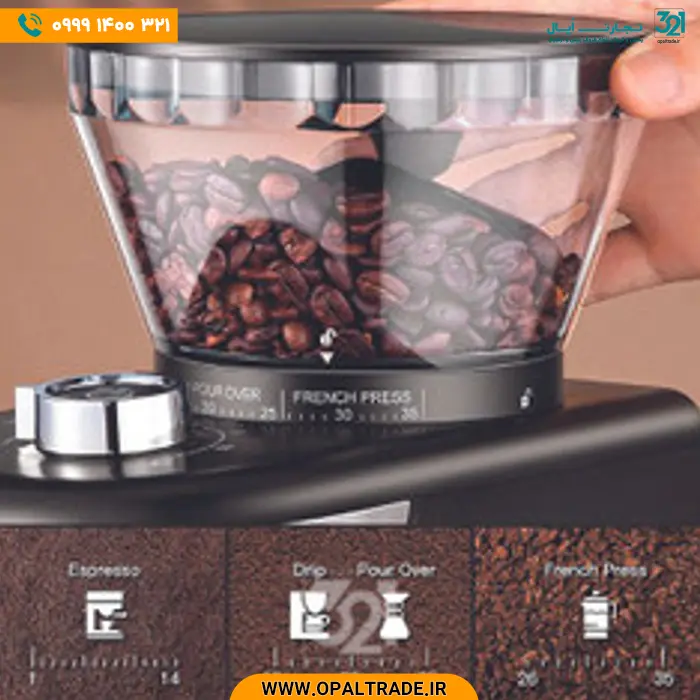 • ظرف نگهداری: شامل یک ظرف برای نگهداری راحت قهوه تازه آسیاب شده، با حفظ عطر و طعم.